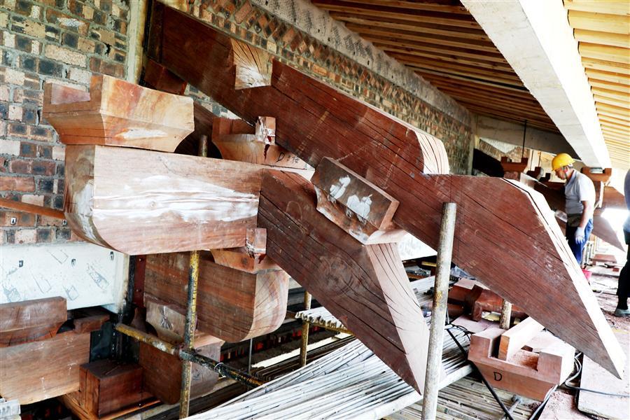 連日來,在該項目湖心閣斗栱安裝現(xiàn)場,每天有20多名經(jīng)驗(yàn)豐富的木工師傅在認(rèn)真進(jìn)行斗栱安裝作業(yè)。為保證項目質(zhì)量,解決項目斗栱安裝難題,加快安裝速度,項目部結(jié)合實(shí)際,通過多次試驗(yàn)和優(yōu)化設(shè)計,確保柱子能承受斗栱重量,采用正裝方式進(jìn)行安裝,保證了安裝速度和安裝質(zhì)量。面對項目選用的木制斗栱材料密度大、重量重、安裝作業(yè)工作面窄等困難,木工師傅結(jié)合自身多年的木工經(jīng)驗(yàn),克服現(xiàn)場施工遇到的困難,相互配合,目前已完成斗栱安裝工作量的三分之一。