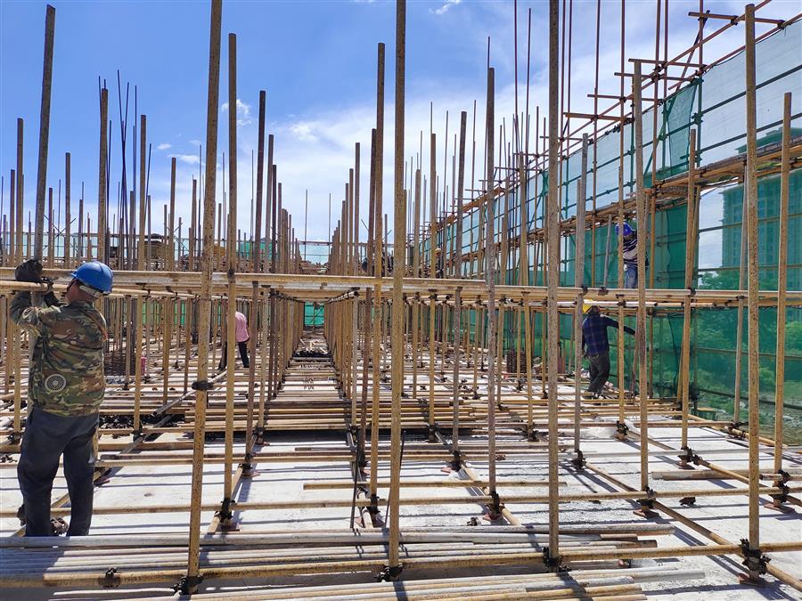 在項目現場,每天有50多名工人頂著高溫,相互配合,有條不紊地進行鋼筋加工、綁扎鋼筋、混凝土澆筑等工作。為了趕工期,他們時常加班加點工作到深夜,同時還認真按照工藝標準逐條逐項落實每一項細節(jié),嚴把工藝質量。