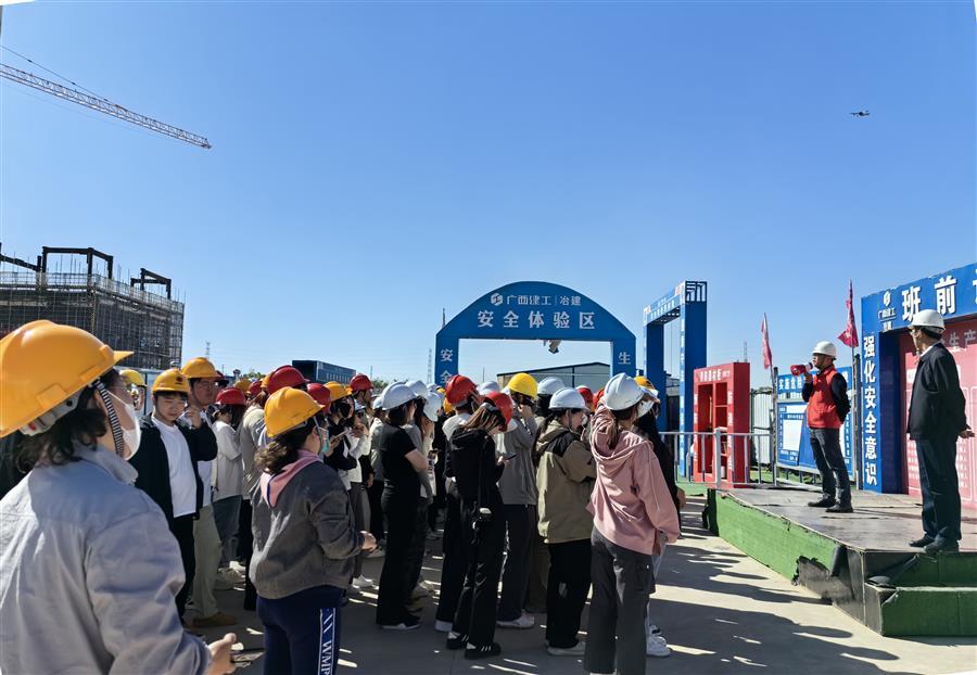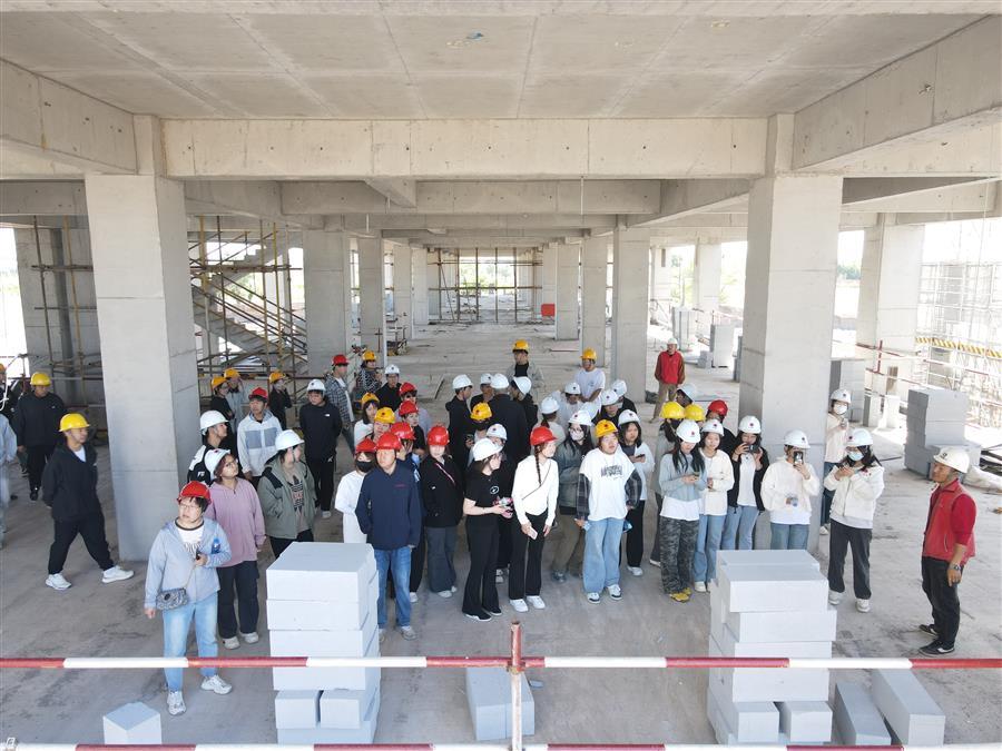 在參觀前,項(xiàng)目負(fù)責(zé)人簡(jiǎn)要介紹了冶建公司發(fā)展歷程和項(xiàng)目概況,詳細(xì)講解了施工現(xiàn)場(chǎng)的各項(xiàng)安全注意事項(xiàng)。之后,所有人員佩戴好安全帽有序進(jìn)入施工現(xiàn)場(chǎng)進(jìn)行參觀。觀摩學(xué)習(xí)過(guò)程中,項(xiàng)目管理人員對(duì)項(xiàng)目正在進(jìn)行的二次結(jié)構(gòu)砌筑、型鋼混凝土結(jié)構(gòu)、盤(pán)扣架以及鋼筋綁扎等工序進(jìn)行了生動(dòng)形象地講解,并就工程的重點(diǎn)、難點(diǎn)問(wèn)題和解決方法開(kāi)展了現(xiàn)場(chǎng)答疑交流,將在建項(xiàng)目施工現(xiàn)場(chǎng)變?yōu)閷?shí)踐課堂,幫助學(xué)生們更好地把理論知識(shí)與實(shí)踐相結(jié)合,推動(dòng)參觀學(xué)習(xí)走深走實(shí)。