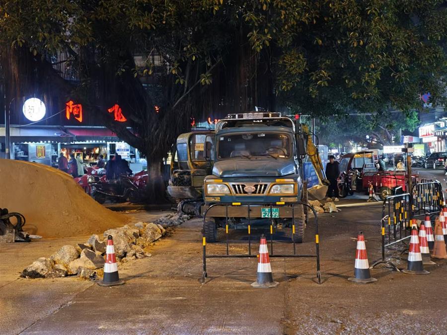 晚上11點多,施工人員在航銀路施工作業(yè)