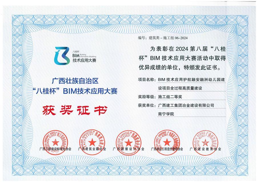 12月30日,冶建公司基礎(chǔ)分公司收到廣西第八屆“八桂杯”BIM技術(shù)應(yīng)用大賽榮獲施工組建筑類二等獎(jiǎng)的獲獎(jiǎng)證書。這是基礎(chǔ)分公司創(chuàng)優(yōu)工作的又一碩果。據(jù)統(tǒng)計(jì),2024年該分公司在BIM技術(shù)方面榮獲國家級獎(jiǎng)3項(xiàng),區(qū)級八桂杯二等獎(jiǎng)1項(xiàng);QC成果榮獲國家級QC成果4項(xiàng),部級QC成果3項(xiàng),區(qū)級QC成果15項(xiàng)。