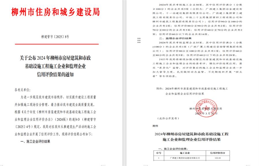 近日,柳州市住房和城鄉(xiāng)建設局發(fā)布《關于公布2024年柳州市房屋建筑和市政基礎設施工程施工企業(yè)和監(jiān)理企業(yè)信用評價結(jié)果的通知》(柳建管字〔2025〕8號),冶建公司以122.18分的優(yōu)異成績,位列柳州市施工企業(yè)信用評價榜首,彰顯了公司在工程質(zhì)量、安全管理及市場信譽等方面的卓越實力。