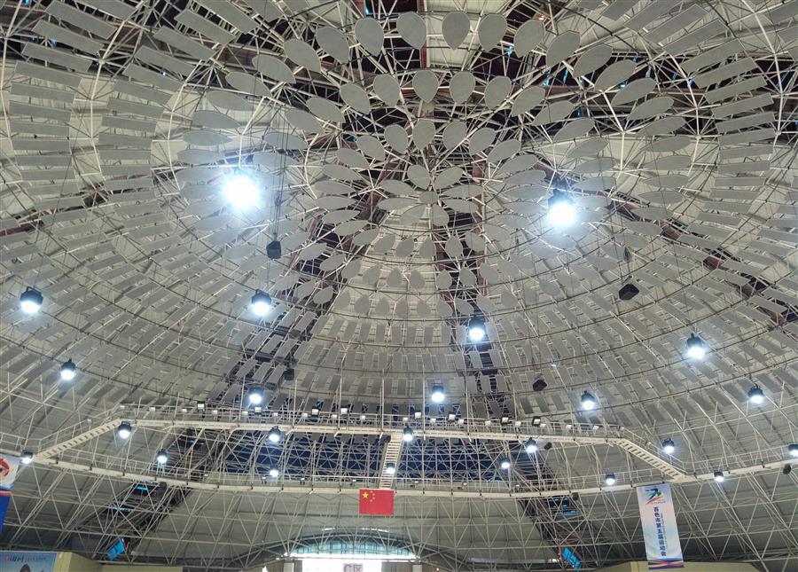 靖西市體育中心(主體育館)項目為主體框架結構、屋蓋鋼結構雙層網(wǎng)殼,建筑層數(shù)為地上三層,總建筑面積14575.74m2,建筑高度為33.40m,設計使用年限50年,建筑抗震設防烈度為6度。屋蓋鋼結構雙層網(wǎng)殼球殼網(wǎng)架高度32.4m,球殼直徑89.994m,建筑投影面積6350m2,觀眾座位數(shù)5909個。工程為圓形鋼網(wǎng)殼結構,采用下弦柱點支承方式,豎向支承面標高10.7m,支座中心布置在直徑為89.994m的圓周上,跨度大,單體工程量大,網(wǎng)殼構件種類多;在網(wǎng)殼上面有四個花瓣造型(壯鄉(xiāng)繡球形狀),花瓣造型四底腳采用桁架結構。