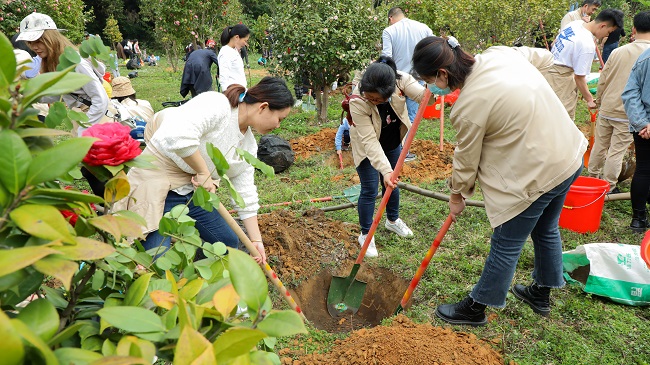 扶正樹苗、填土夯苗、踩實(shí)泥土、提桶澆水......植樹現(xiàn)場一片忙碌的景象。在專業(yè)技術(shù)人員“紅馬甲”的指導(dǎo)下,大家分工明確,配合默契,栽下一棵棵寄寓“相思”的紅豆樹苗。植樹活動(dòng)結(jié)束后,青年志愿者還進(jìn)行了園林清掃活動(dòng)。