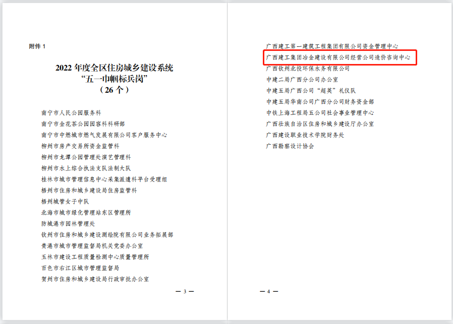 近日,廣西建設工會工作委員會下發(fā)了《關于命名2022年度全區(qū)住房城鄉(xiāng)建設系統(tǒng)“五一巾幗標兵崗”“五一巾幗標兵”的決定》,冶建經營公司造價咨詢中心榮獲“五一巾幗標兵崗”稱號。